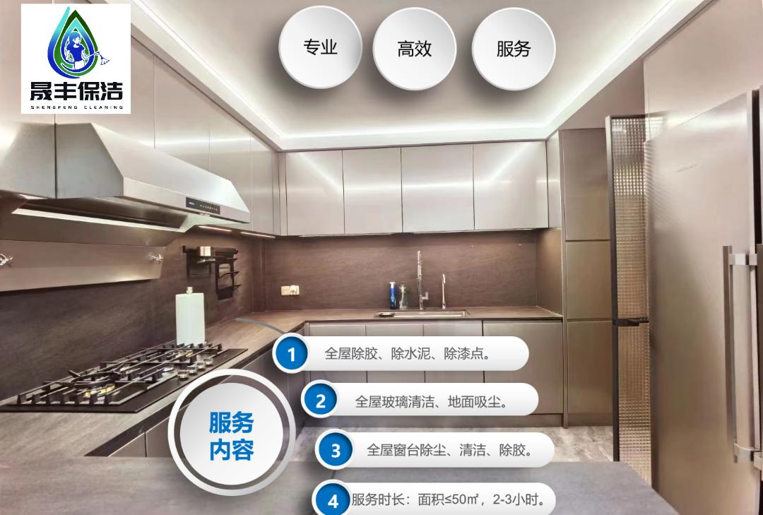 1、服务内容:全屋玻璃、全屋地面、全屋吸尘、窗框、窗槽、台面、踢脚线、全屋除胶、除漆、除水泥点。(厨房、卫生间、客厅、卧室、餐厅、阳台) 2、服务时长:面积≤50㎡,2-3小时。 3、本服务不含项目:大量零散物品整理、电器设备清洗;工艺品、玉器、古董字画、宗教陈设、花草绿植、天花板清洁、高空作业;衣柜收纳、灯具清洁(除落地灯)、衣服鞋子清洗。
