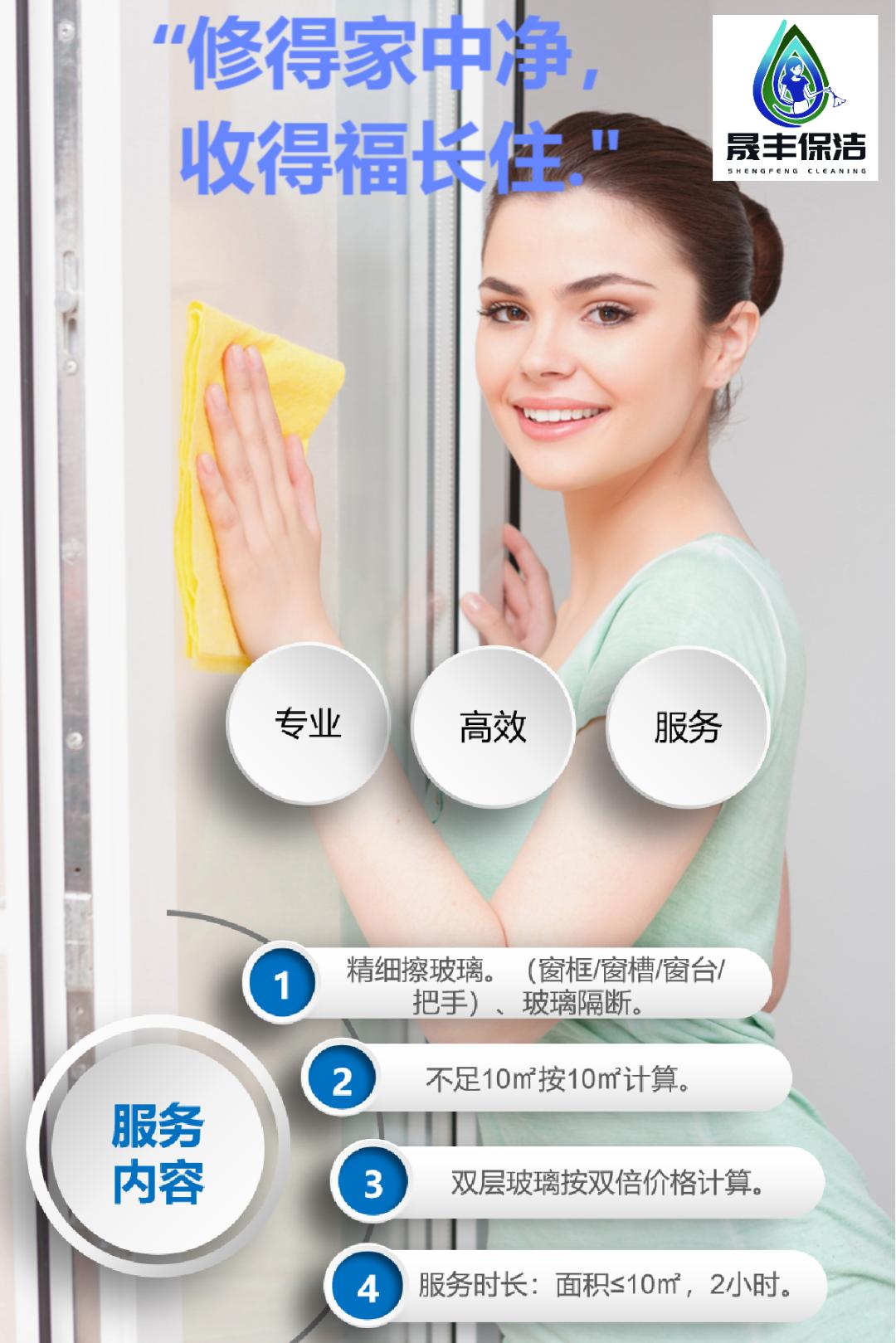 1、服务内容:精细擦玻璃。(窗框/窗槽/窗台/把手)、玻璃隔断。 2、服务时长:面积≤10㎡,2小时。 不足10㎡按10㎡计算;双层玻璃按双倍价格计算。 3、本服务不含项目:大量零散物品整理、电器设备清洗;工艺品、玉器、古董字画、宗教陈设、花草绿植、天花板清洁、高空作业;衣柜收纳、灯具清洁(除落地灯)、衣服鞋子清洗。