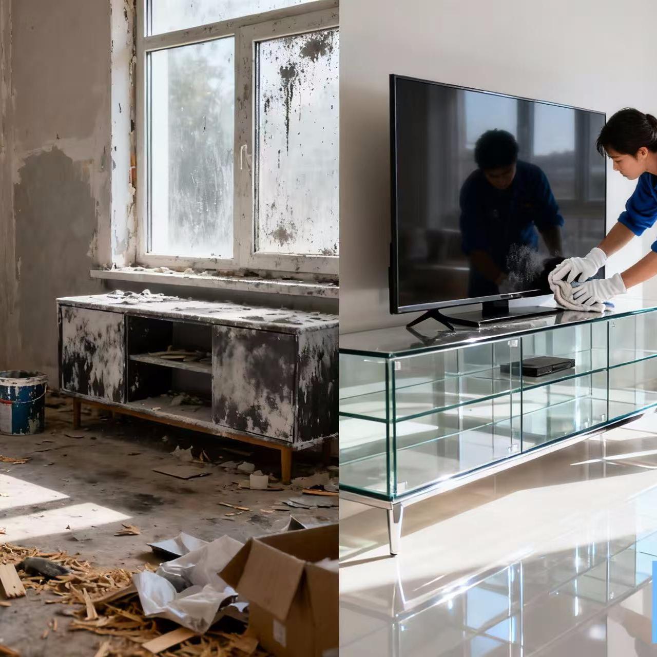 本服务适用于装修后未入住的新居,服务人员携专业清洁工具上门服务。 服务面积按照房屋建筑面积计算,不足50m²按照50m²收费。复式、跃层格局将按使用面积叠加计算,如:复式二层,服务面积=建筑面积+二层使用面积。 服务内容: 1. 涂料、水泥点、玻璃胶等装修痕迹清除; 2. 墙面、顶棚除尘,地面清洁,室内外玻璃清洁; 3. 厨卫整体清洁,瓷砖、龙头管件等清洁; 4. 家电表面清洁,家具橱柜内外清洁; 注意事项: 1. 未装修完成的房屋,建议在装修完成后预约; 2. 大型建筑垃圾请您提前联系装修公司移除; 3. 家电内部清洗、灯具、窗纱、窗帘等清洗不包含在本服务项目内。 服务保障: 1. 价格透明:不现场加价,无额外收费; 2. 不满意重服务:若出现服务质量问题,免费返工。